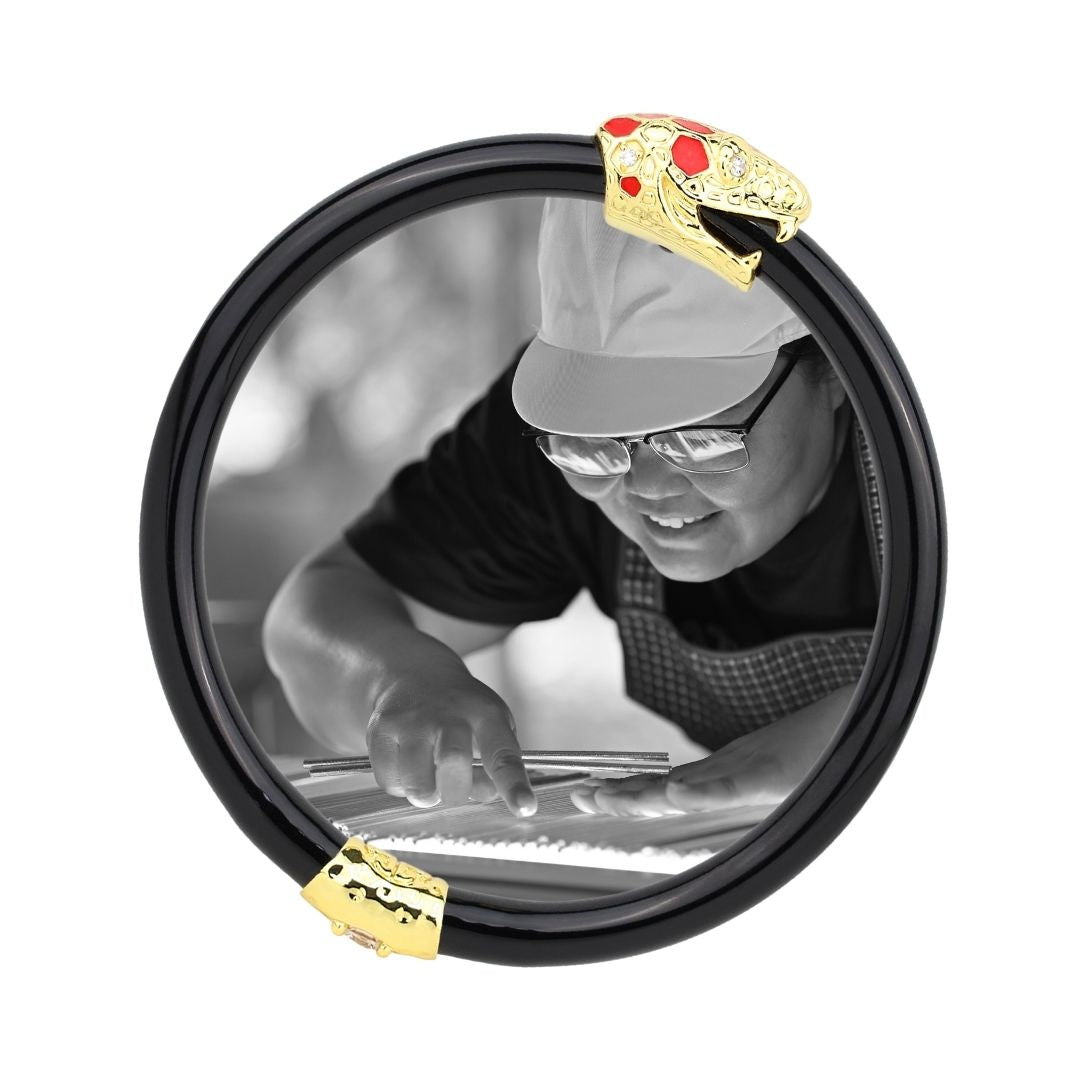 The main visionary artisan behind this bangle is Pukki, whose meticulous craftsmanship brings this piece to life. Handcrafted in Bangkok, each bangle is a testament to artistry and tradition, blending modern design with timeless techniques. Made with care, it reflects the skill and dedication of its maker, ensuring a piece that is as meaningful as it is beautiful.