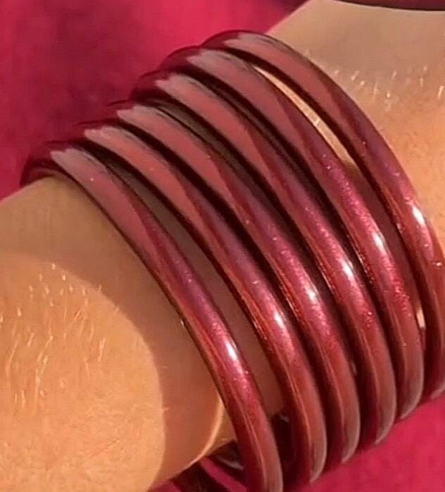 Ritual Mindful Glamour: Pausa. Respira. Ponte tus Merlot All Weather Bangles enfocándote en la cosecha de tu viaje y la riqueza de tu devenir.