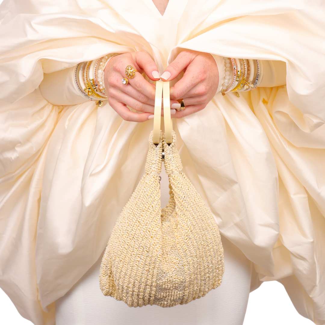 Ti presentiamo Elsa, la borsa a mano che incarna le stesse qualità delle donne straordinarie a cui ci ispiriamo. Questo capolavoro realizzato con perline color avorio racchiude un'essenza angelica ed è curato in ogni dettaglio: ogni perlina è cucita a mano per creare un effetto elaborato e sorprendente che non passerà di certo inosservato.