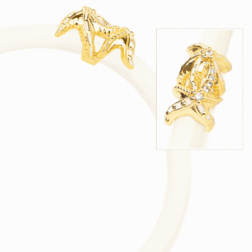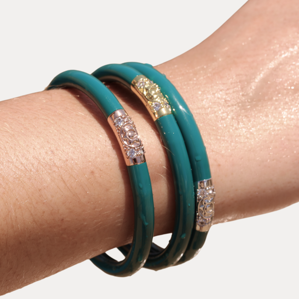 Every bangle is adorned with a sculpted animal head, richly enameled and sparkling with delicate clear crystals, set upon our signature tubing in hues that reflect the essence of these magnificent beings.