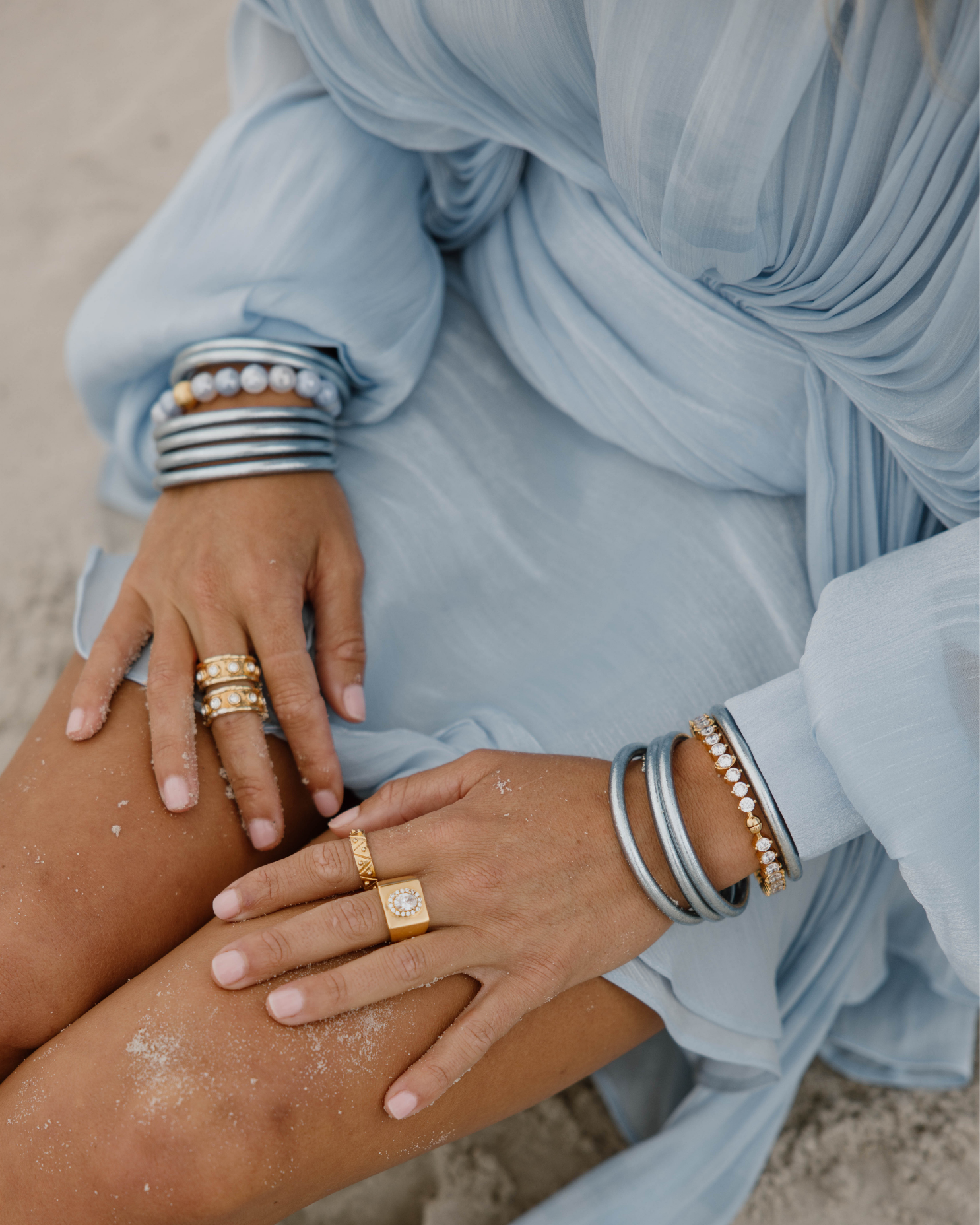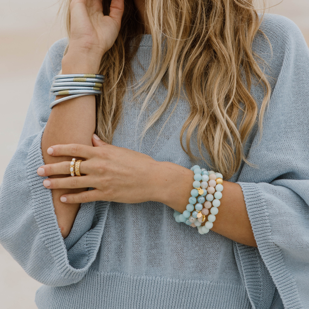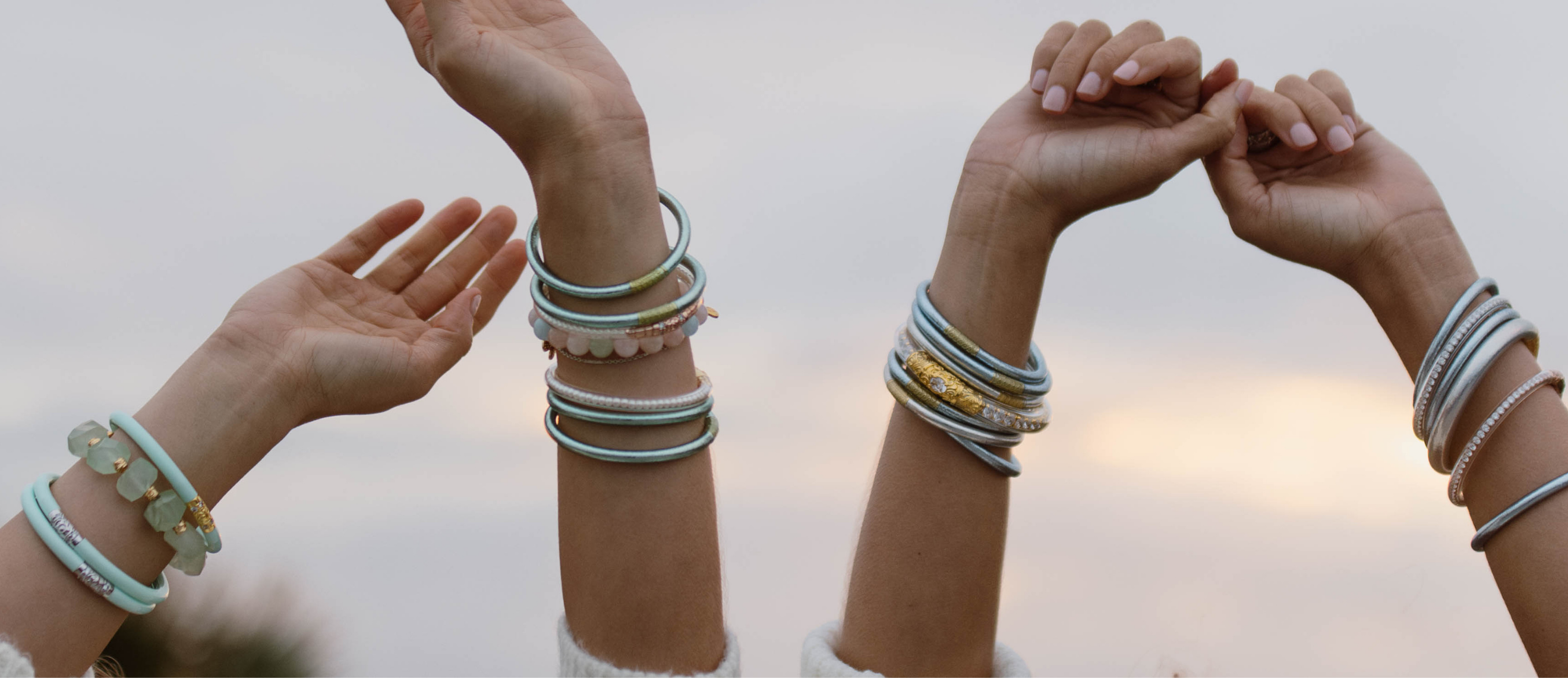 Like the sky stretching over the horizon or the sea mirrored in a cloudless dawn. BuDhaGirl introduces Celeste to our All-Weather Bangle® collection: a luminous, cool blue that captures the timeless glow of ocean-worn sea glass. Celeste invites transformation